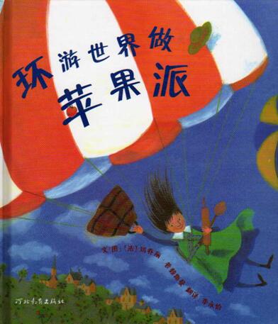 《环游世界做苹果派》是一本很幽默、很荒诞的故事书 ,作者的想象力让人在觉得夸张之余忍俊不禁,封面上的小女孩背着降落伞从天上飘飘荡荡的下来,头发让风刮得往上飘,一手抓着大袋子一手还抱着擀面仗、大勺子……。